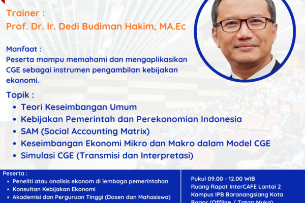 π’ Pelatihan Computable General Equilibrium (CGE) dan Aplikasi nya Manfaat : Peserta mampu memahami dan mengaplikasikan CGE sebagai instrumen pengambilan kebijakan ekonomi. π― Apa saja yang akan dipelajari? π Waktu & Tempat:ποΈ Bulan Februari 2026 | π Pukul 09.00 β 12.00 WIB π Offline: Ruang Rapat InterCAFE Lantai 2 Gedung MWA Kampus IPB Baranangsiang Kota…